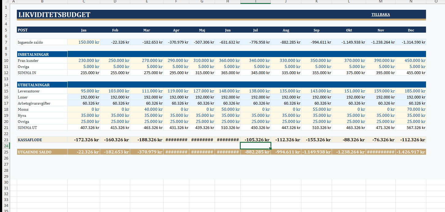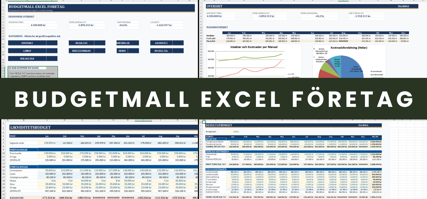 Sveriges mest kompletta budgetmall för småföretag och aktiebolag. Innehåller resultatbudget, likviditetsbudget, lönekalkylator, momsöversikt, nyckeltal och break-even analys – allt kopplat automatiskt med svenska skattesatser.