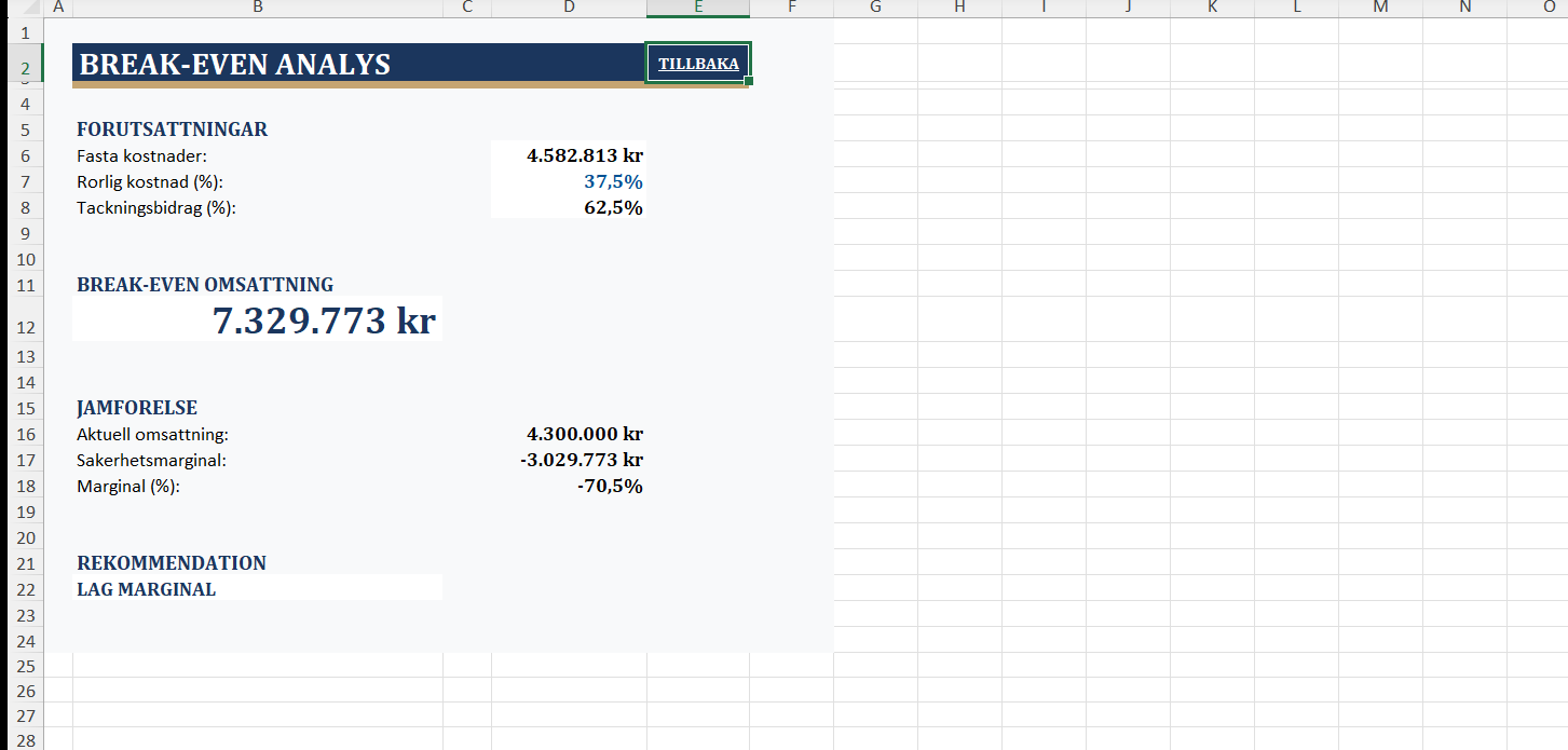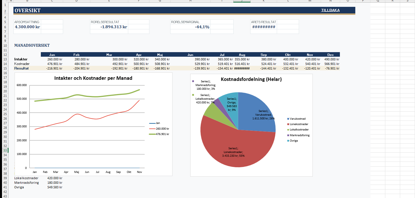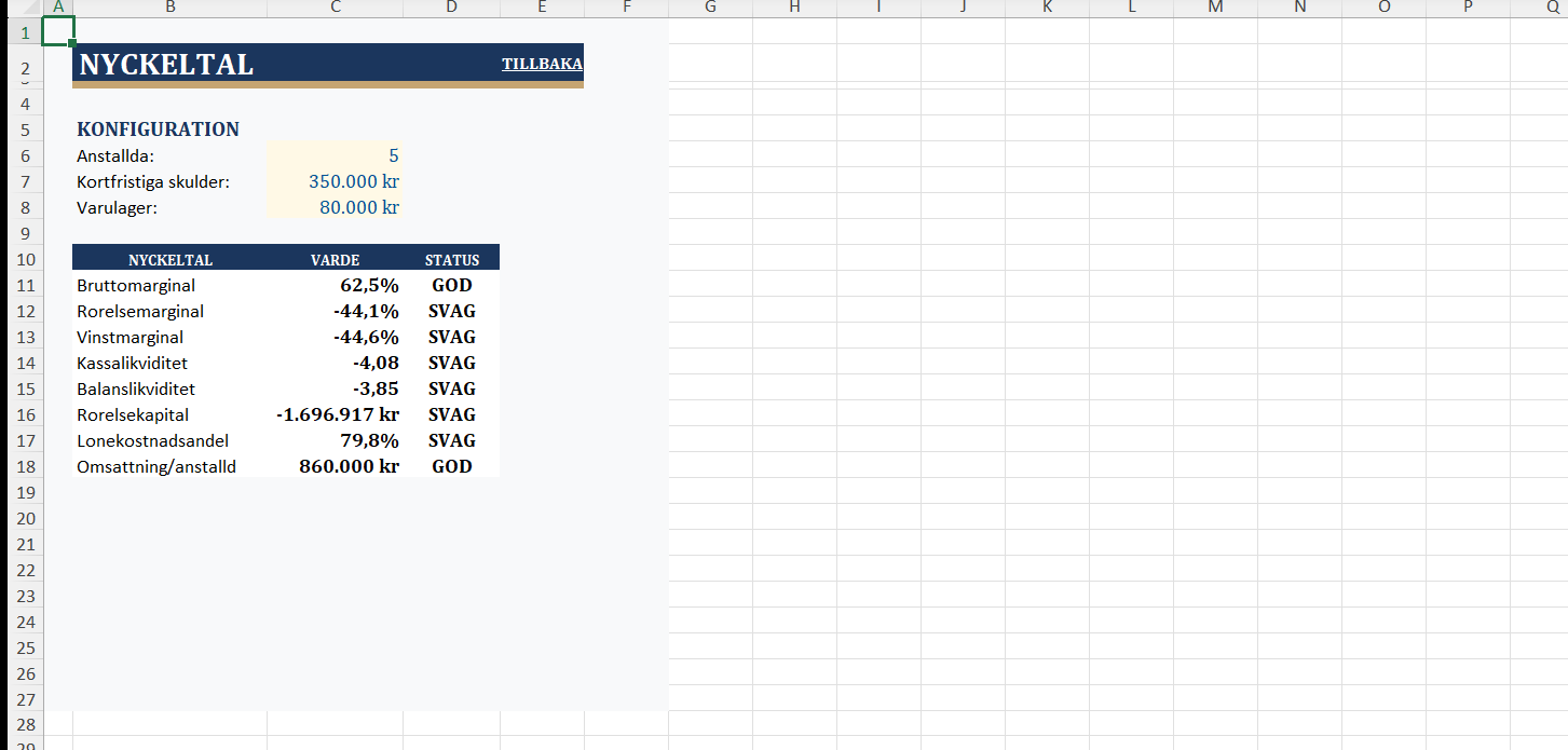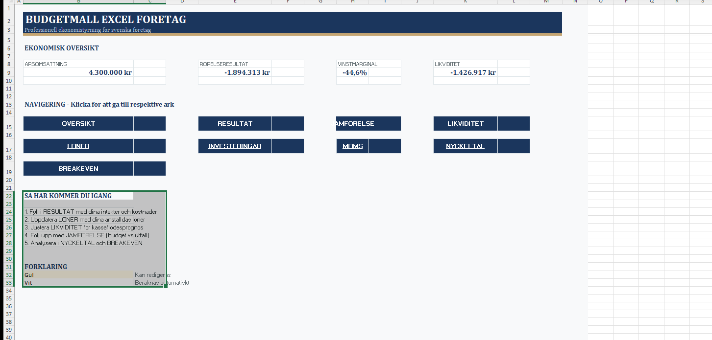 Navigation med ett klick till alla blad. Se årsomsättning, rörelseresultat, vinstmarginal och likviditet direkt. Färgkodad guide för att komma igång på 5 minuter.