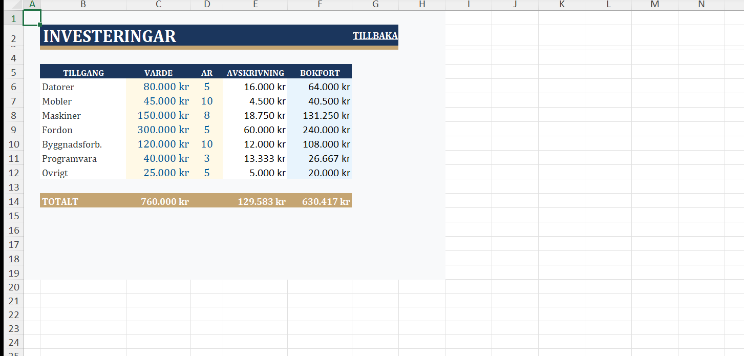 Investeringsplan med 7 tillgångskategorier. Automatisk beräkning av årlig avskrivning baserat på ekonomisk livslängd. Bokfört värde uppdateras automatiskt.