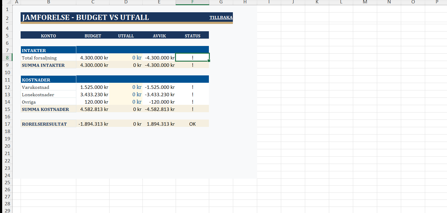 Budget vs utfall på ett blad. Fyll i faktiskt utfall och se avvikelse direkt i kronor och procent. Automatisk status (OK/!) visar om du ligger över eller under budget.
