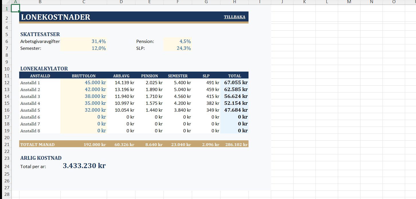 Lönekalkylator för upp till 8 anställda. Automatisk beräkning av arbetsgivaravgifter (31,42%), tjänstepension (4,5%), semesterersättning (12%) och SLP (24,26%). Total lönekostnad per månad och år.