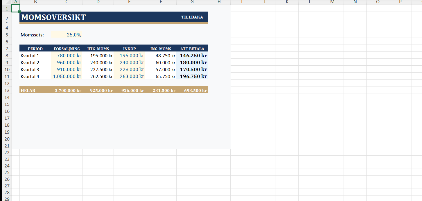 Momsredovisning per kvartal. Beräkna utgående och ingående moms automatiskt (25%). Se moms att betala för varje kvartal och hela året. Information om reducerade momssatser (12%, 6%).