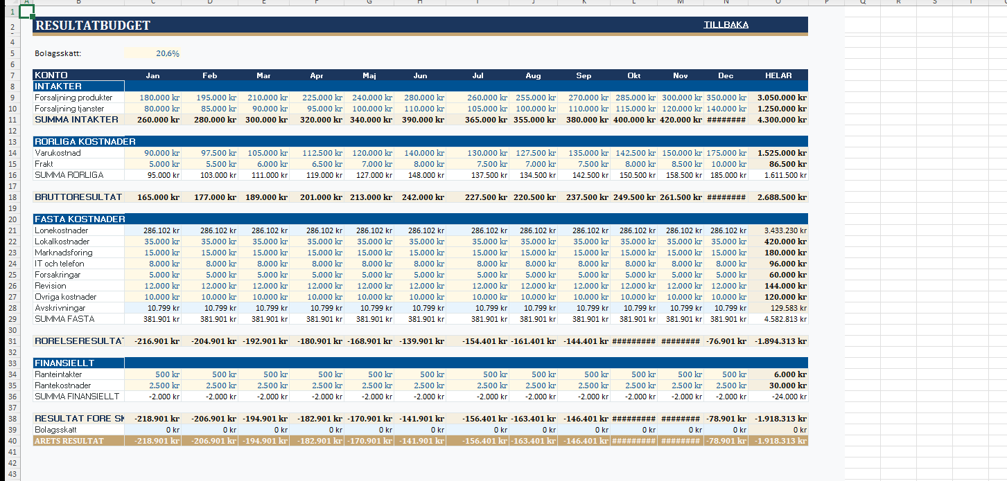 Komplett resultatbudget med 12 månader + helårskolumn. Intäkter, rörliga kostnader, fasta kostnader, rörelseresultat, finansiella poster och årets resultat. Bolagsskatt beräknas automatiskt (20,6%).
