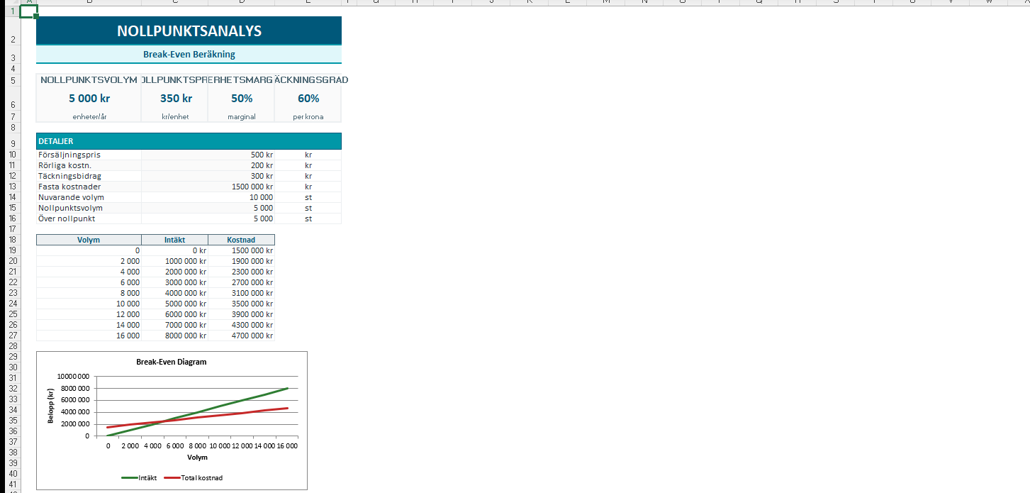 Beräkna nollpunktsvolym, nollpunktspris, säkerhetsmarginal och täckningsgrad automatiskt. Diagram visar var intäkter och kostnader möts.
