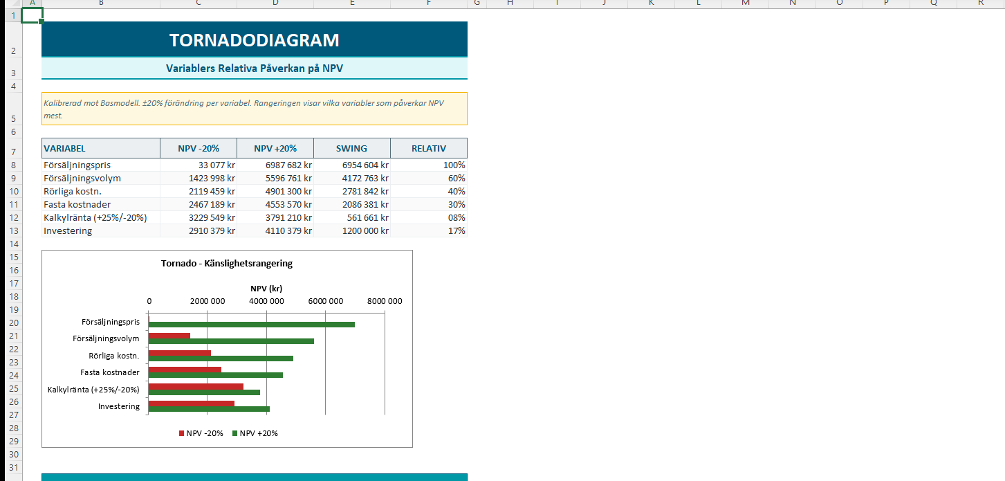 Sveriges mest kompletta känslighetsanalys Excel-mall för investeringsbeslut. Innehåller NPV, IRR, scenarioanalys, tornado-diagram och nollpunktsberäkning med automatisk kalibrering.