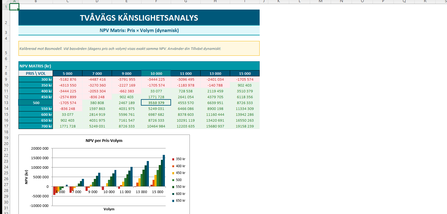 NPV-matris med 9×7 kombinationer av pris och volym. Färgkodning visar positiva (gröna) och negativa (röda) nuvärden. Perfekt för att identifiera kritiska gränser.