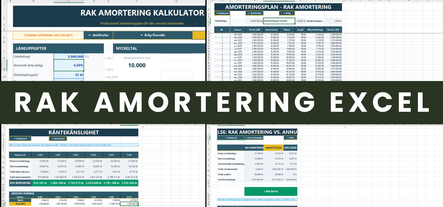 Den mest kompletta Excel-mallen för rak amortering på den svenska marknaden. Innehåller amorteringsplan, jämförelse med annuitetslån, räntekänslighetsanalys och automatiskt dashboard. Uppfyll amorteringskraven och optimera din bolånekostnad.