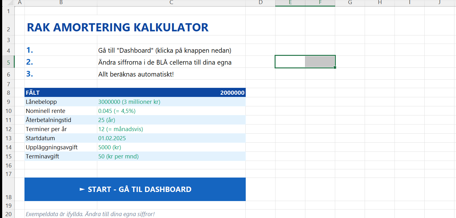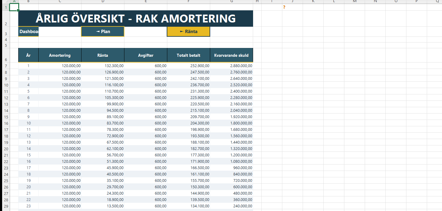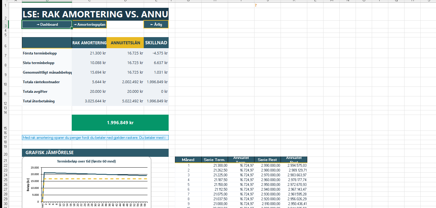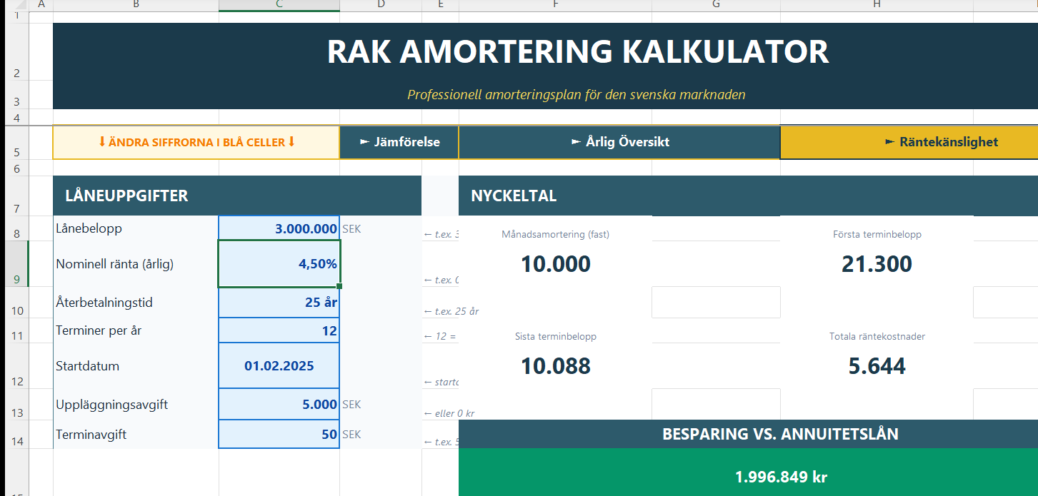 Till skillnad från enkla onlinekalkylatorer får du här en komplett översikt med 300 terminer, årlig sammanställning, grafisk jämförelse mot annuitetslån, och möjlighet att simulera extra amorteringar. Allt uppdateras automatiskt när du ändrar lånedata. Perfekt för att uppfylla amorteringskravet och planera din ekonomi långsiktigt.