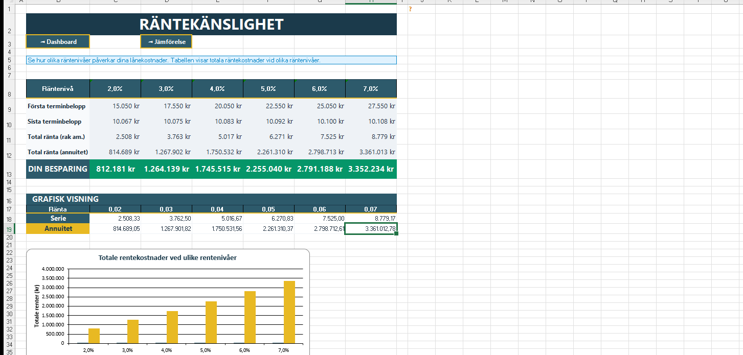 Se hur olika räntenivåer (2%-7%) påverkar månadsbelopp och totala räntekostnader. Bedöm om du klarar en räntehöjning innan du väljer rak amortering.