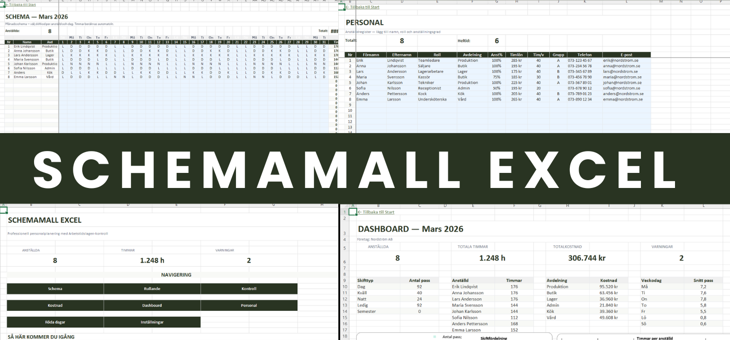 Letar du efter en schema mall i Excel för att schemalägga personal? Vår professionella schemamall hanterar allt från månadsschema och rullande skiftschema till automatisk kontroll mot Arbetstidslagen – inklusive dygnsvila (11h), veckovila (36h) och övertidsgränser.