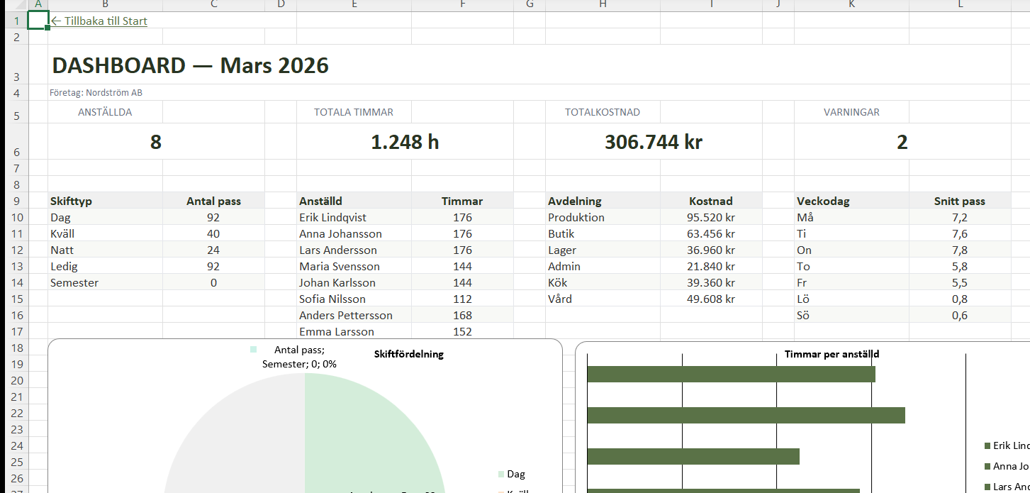 Visuell översikt med 4 KPI-rutor och 4 diagram: bemanning per dag, timfördelning per skift, kostnadsöversikt per avdelning och arbetstidsfördelning. Alla värden beräknas automatiskt.
