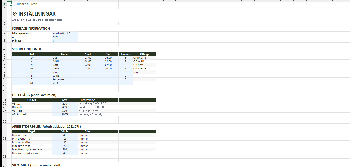 Anpassa allt: företagsnamn, år/månad, skiftdefinitioner (tider, timmar), OB-procentsatser, arbetstidsregler och vilotabell. Alla ändringar sprids automatiskt till hela mallen.