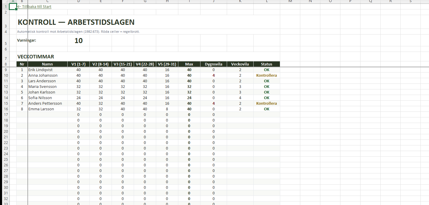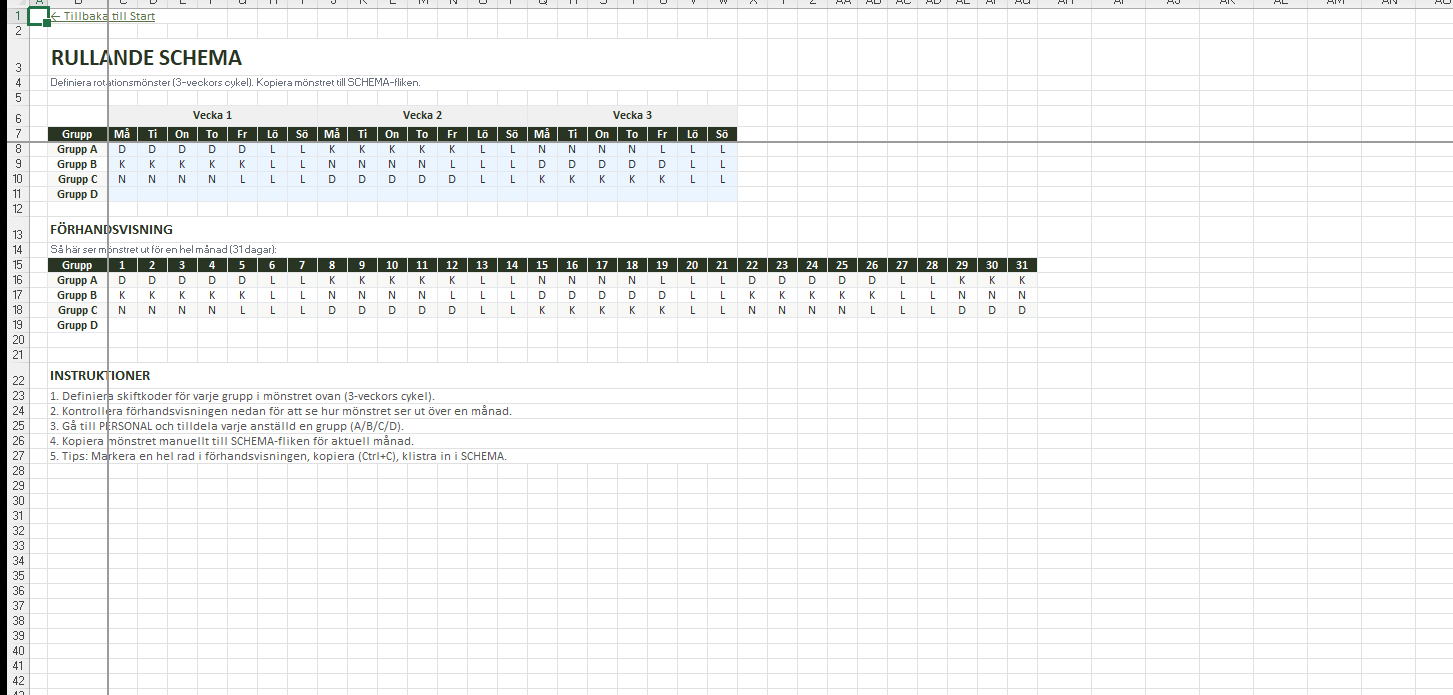 Viktig information: Denna mall är ett stödverktyg för schemaläggning och ersätter inte juridisk rådgivning. Arbetstidslagen kan avvika genom kollektivavtal — det är arbetsgivarens ansvar att säkerställa att schemat uppfyller gällande krav.
