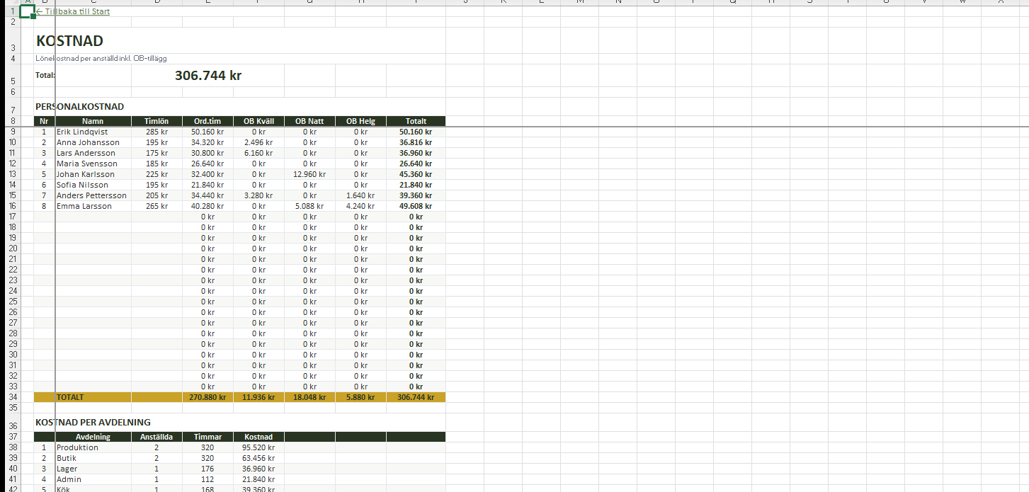 Personalkostnad per avdelning med automatisk beräkning av grundlön och OB-tillägg (kväll, natt, helg). Summering per månad med snittlön och total kostnad – perfekt för budgetering.
