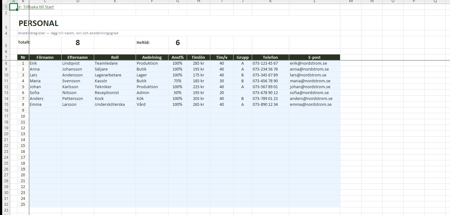 Komplett personalregister med namn, befattning, avdelning, anställningsgrad, timlön, kontaktuppgifter och gruppindelning (A–D). Kopplat till alla övriga flikar.