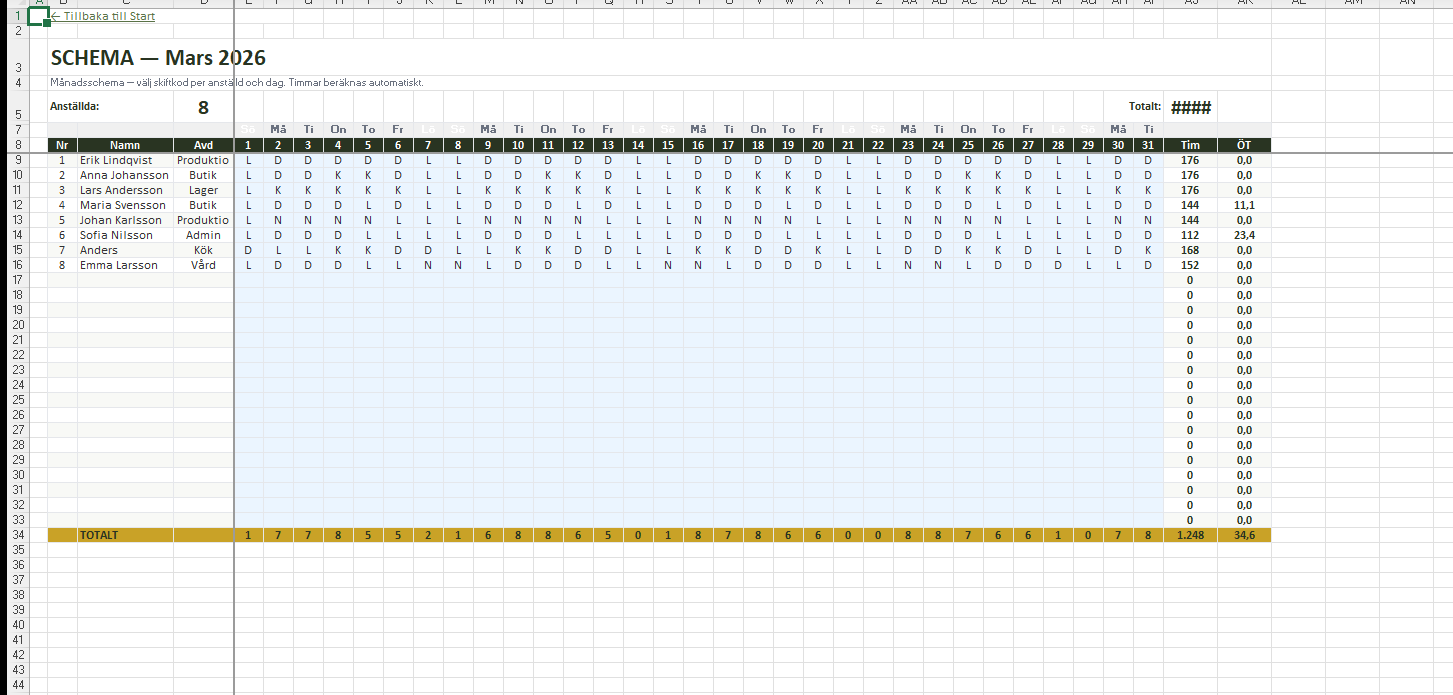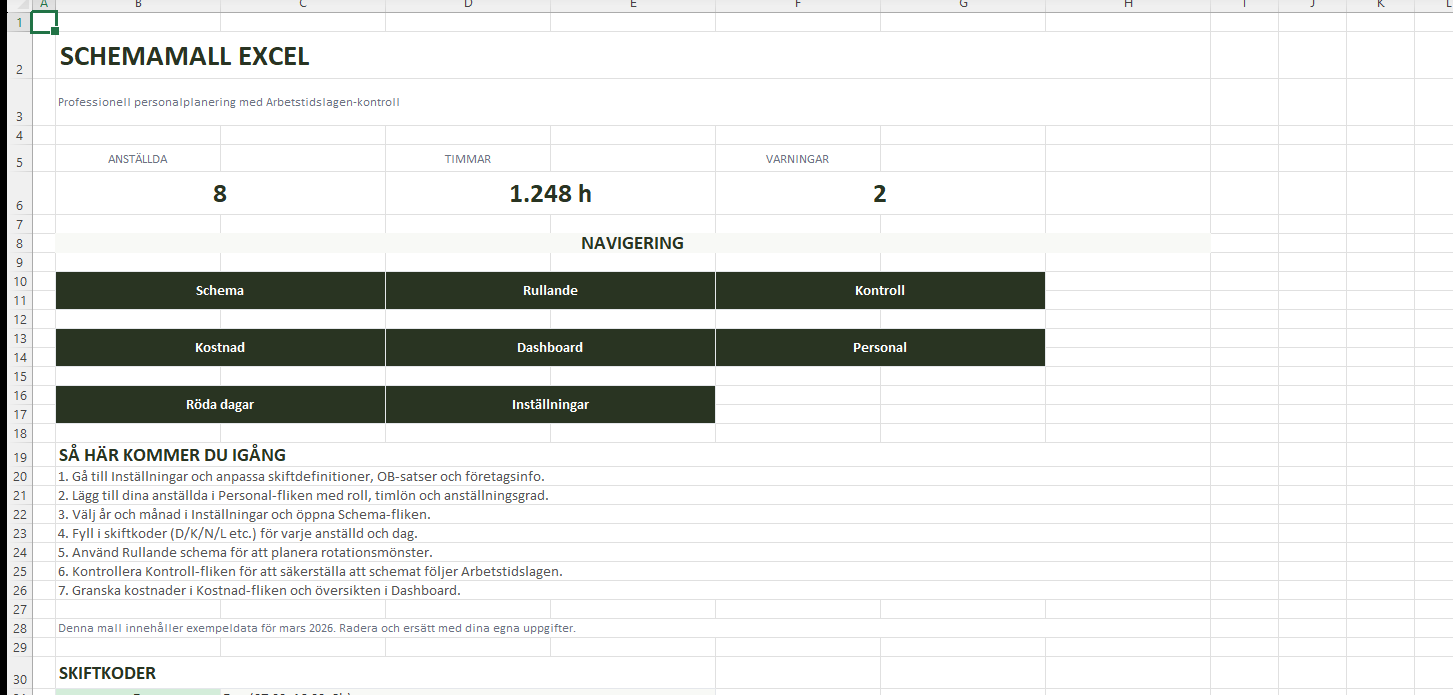 Sveriges mest kompletta schema mall i Excel. Schemalägg personal med 8 skifttyper, kontrollera automatiskt mot Arbetstidslagen (1982:673), beräkna personalkostnader med OB-tillägg och få en fullständig översikt – allt i en enda Excel-fil med 890+ formler.