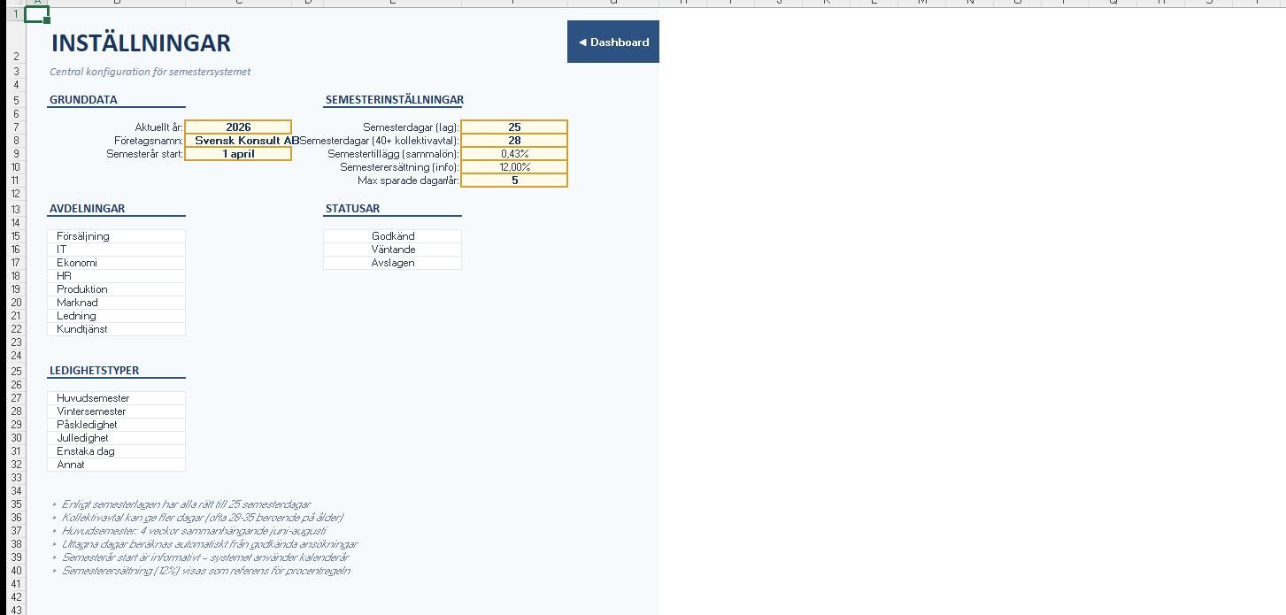 Central konfiguration av år, företagsnamn, semesterdagar och procentsatser. Dropdown-listor för avdelning, status och ledighetstyp förhindrar felskrivningar.