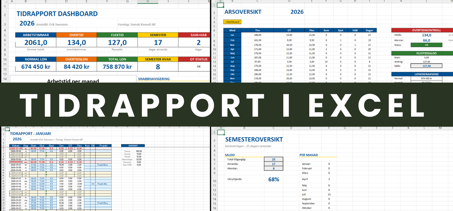 Mallen innehåller allt du behöver: 12 månadsark med daglig registrering, automatiskt dashboard med 10 KPI:er, komplett semesteröversikt, 13 svenska röda dagar, och årsöversikt som uppdateras i realtid. Perfekt för timanställda, konsulter, projektarbetare och personal med flextid.