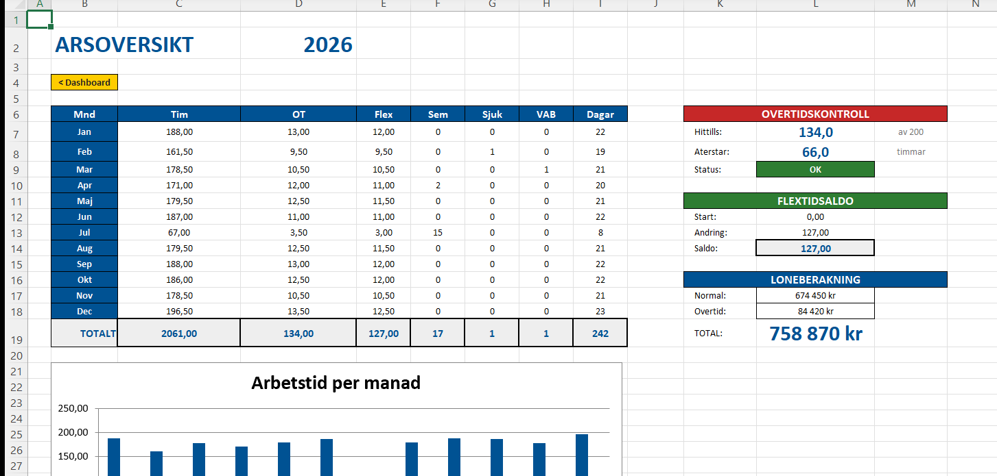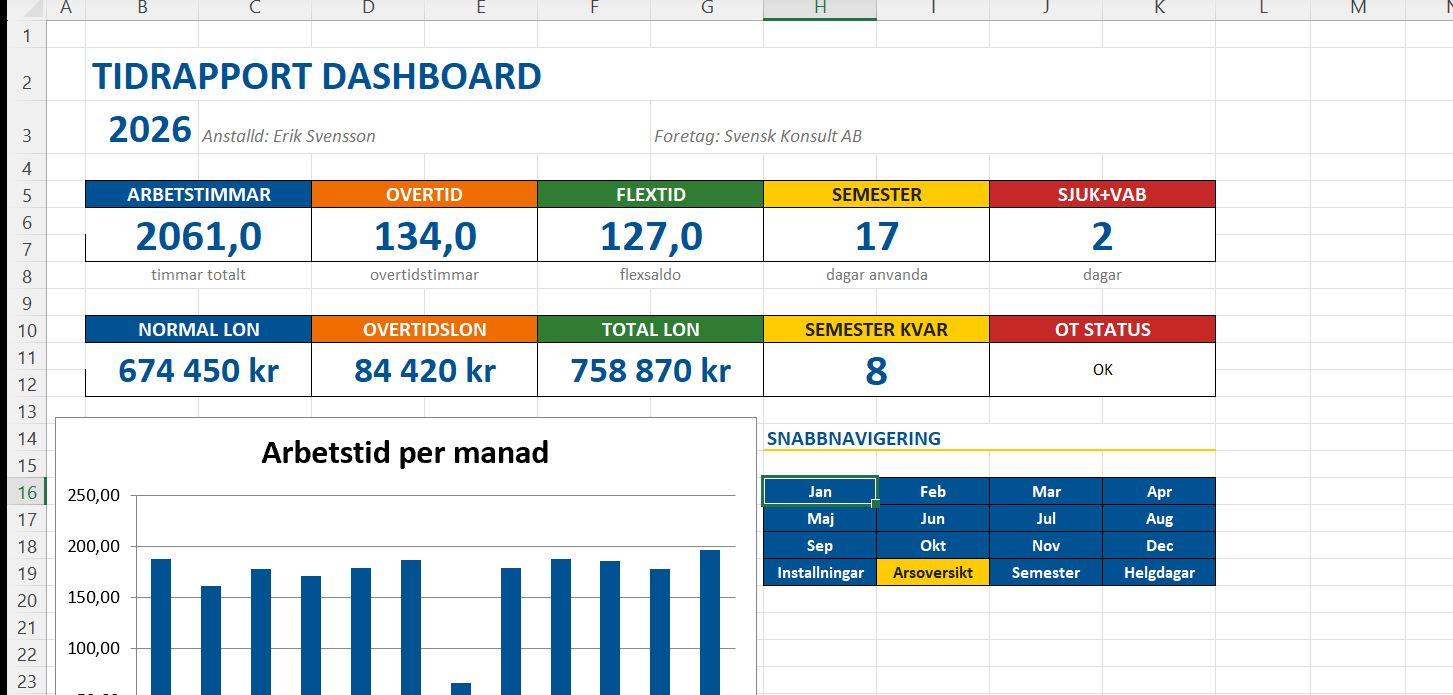 Se arbetstimmar, övertid, flextid, semester och lön med ett ögonkast. 10 KPI-kort och diagram uppdateras automatiskt. Snabbnavigering till alla ark.