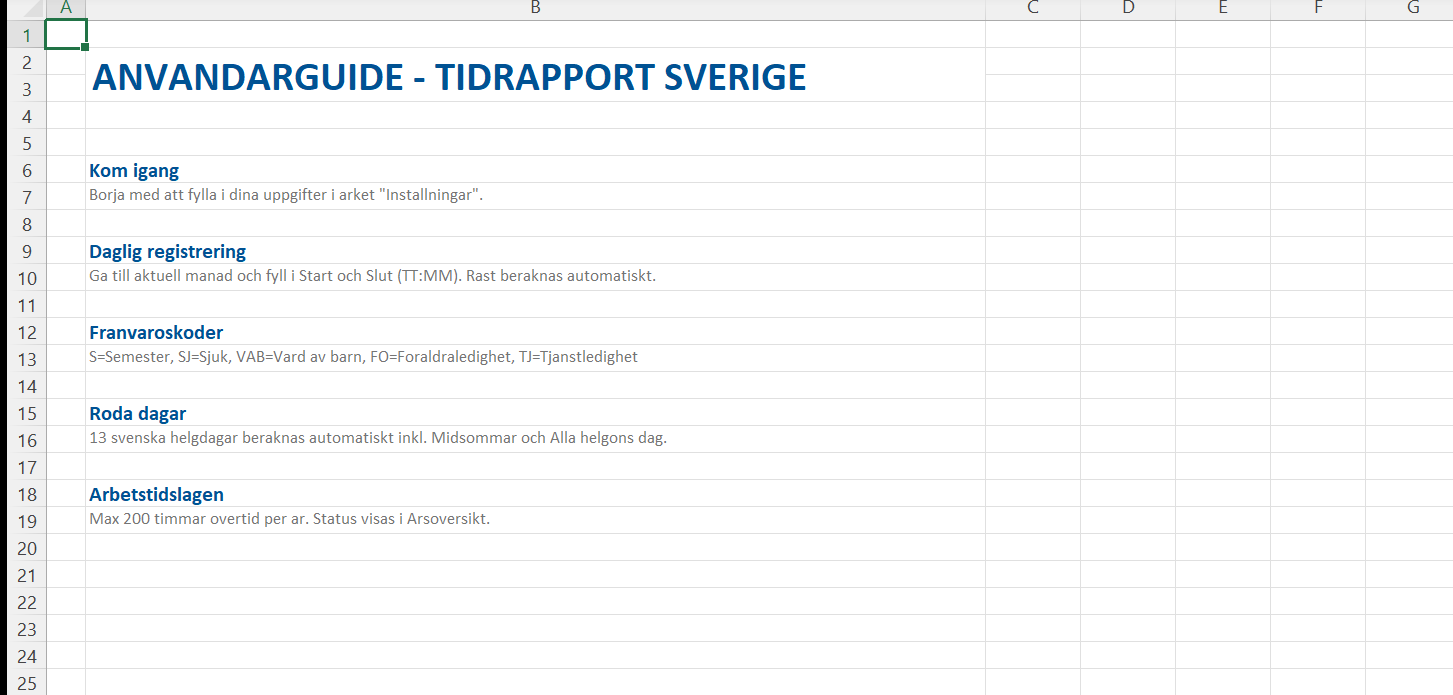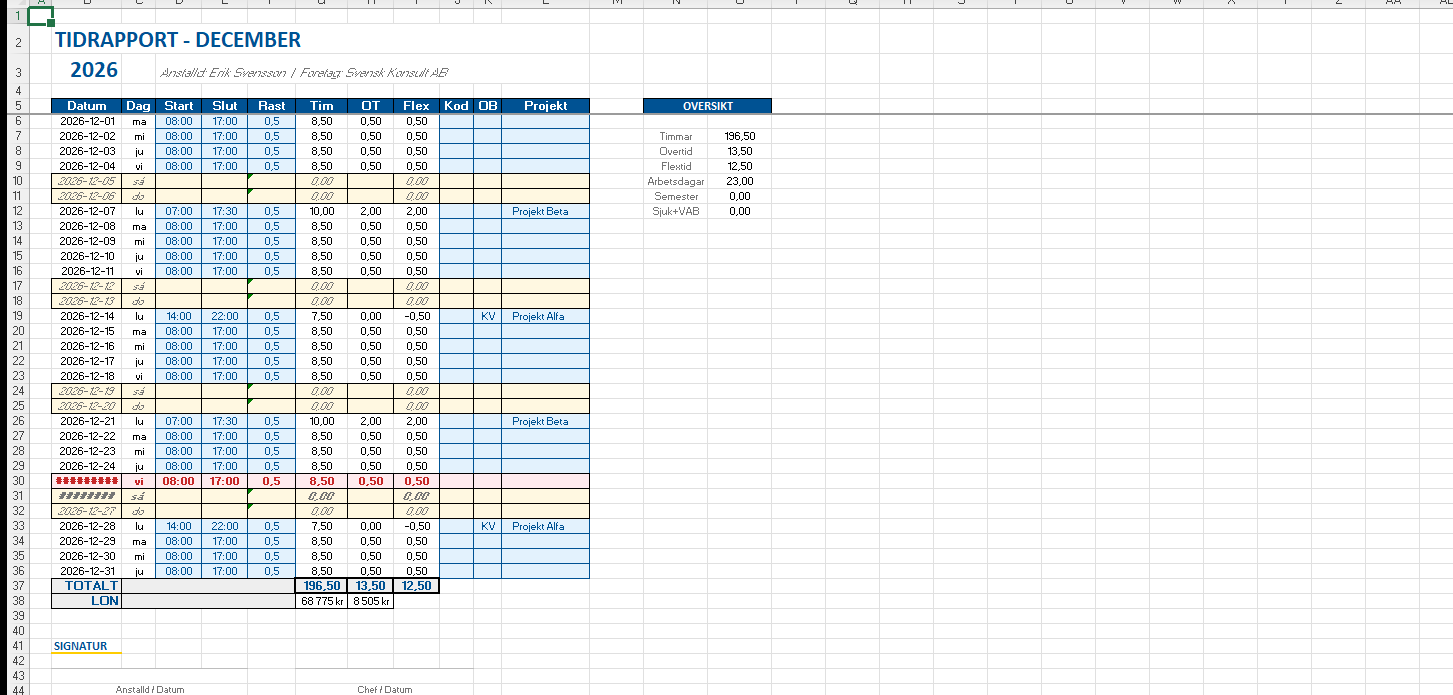 Den mest kompletta tidrapportmallen för svenska företag och anställda. Används av tusentals svenska arbetsplatser – från småföretag till stora organisationer.