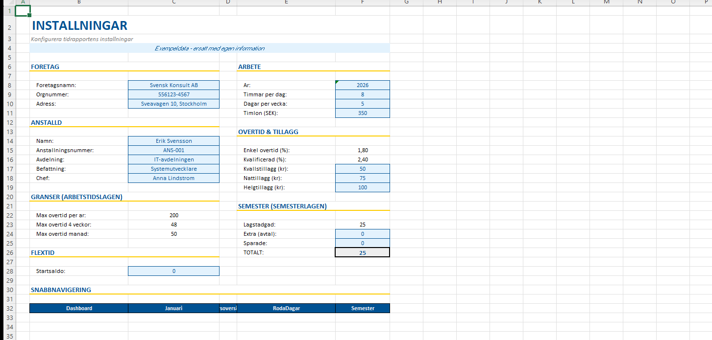 Konfigurera företag, anställd, arbetstid (8 tim/dag), timlön, övertidstillägg och OB-tillägg. Alla värden kopplas automatiskt till resten av mallen.