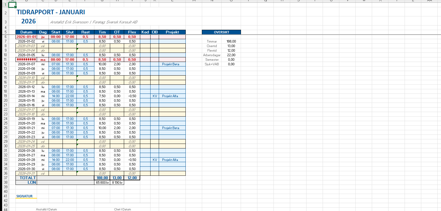 Ett ark för varje månad med daglig registrering av start, slut, rast och frånvaroskod. Automatisk beräkning av timmar, övertid och flex per dag.