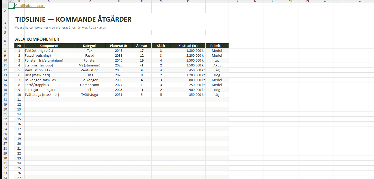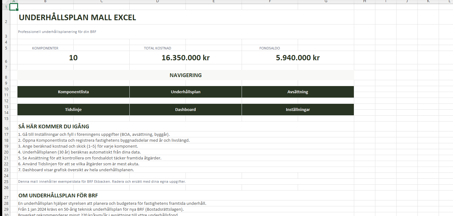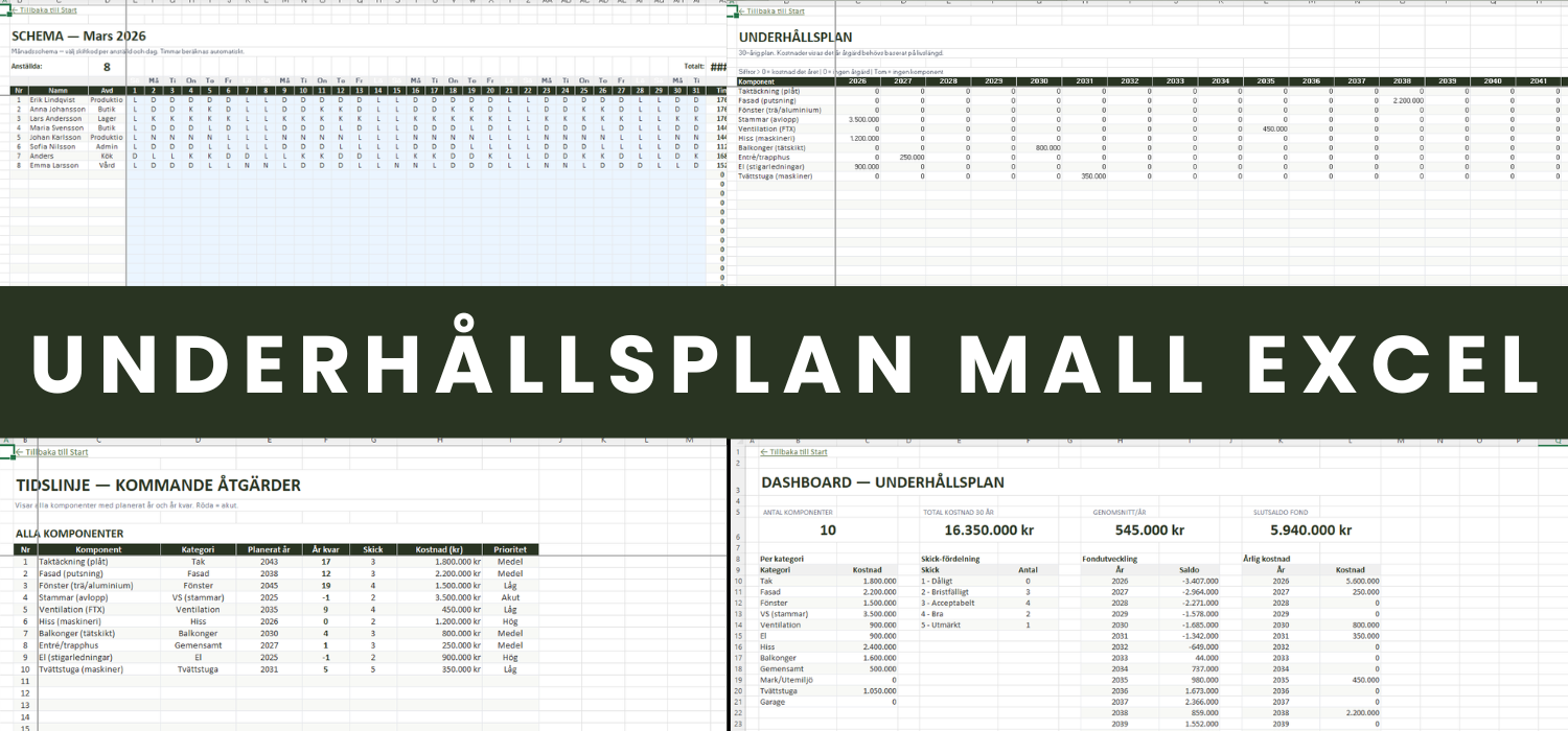 Mallen innehåller 7 professionella flikar, över 1 600 formler, plats för 30 byggnadskomponenter och en 30-års underhållsplan med automatisk placering av åtgärder. Du får också en fondprognos som visar om er årliga avsättning räcker, ett dashboard med 4 diagram och en tidslinje som sorterar alla kommande åtgärder efter prioritet.