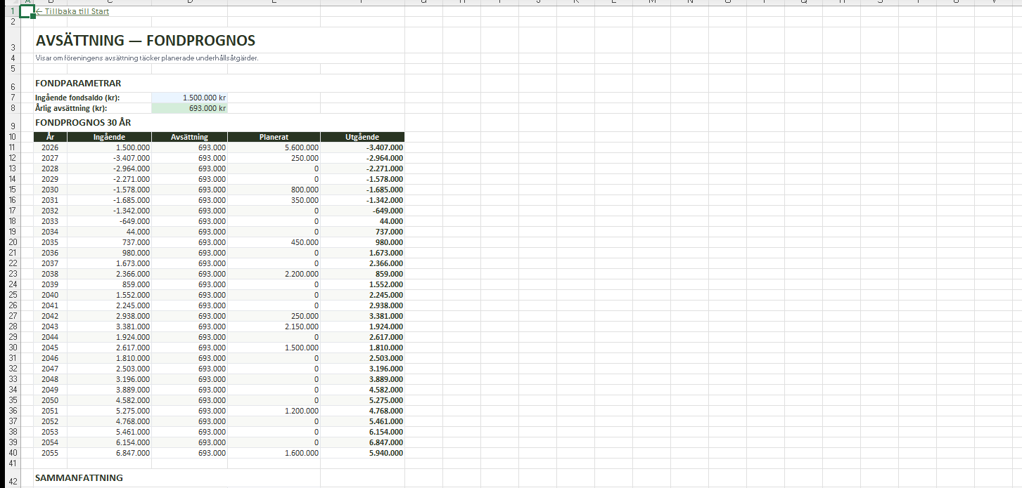 Underhållsplan Mall Excel – BRF 30-års plan med fondprognos