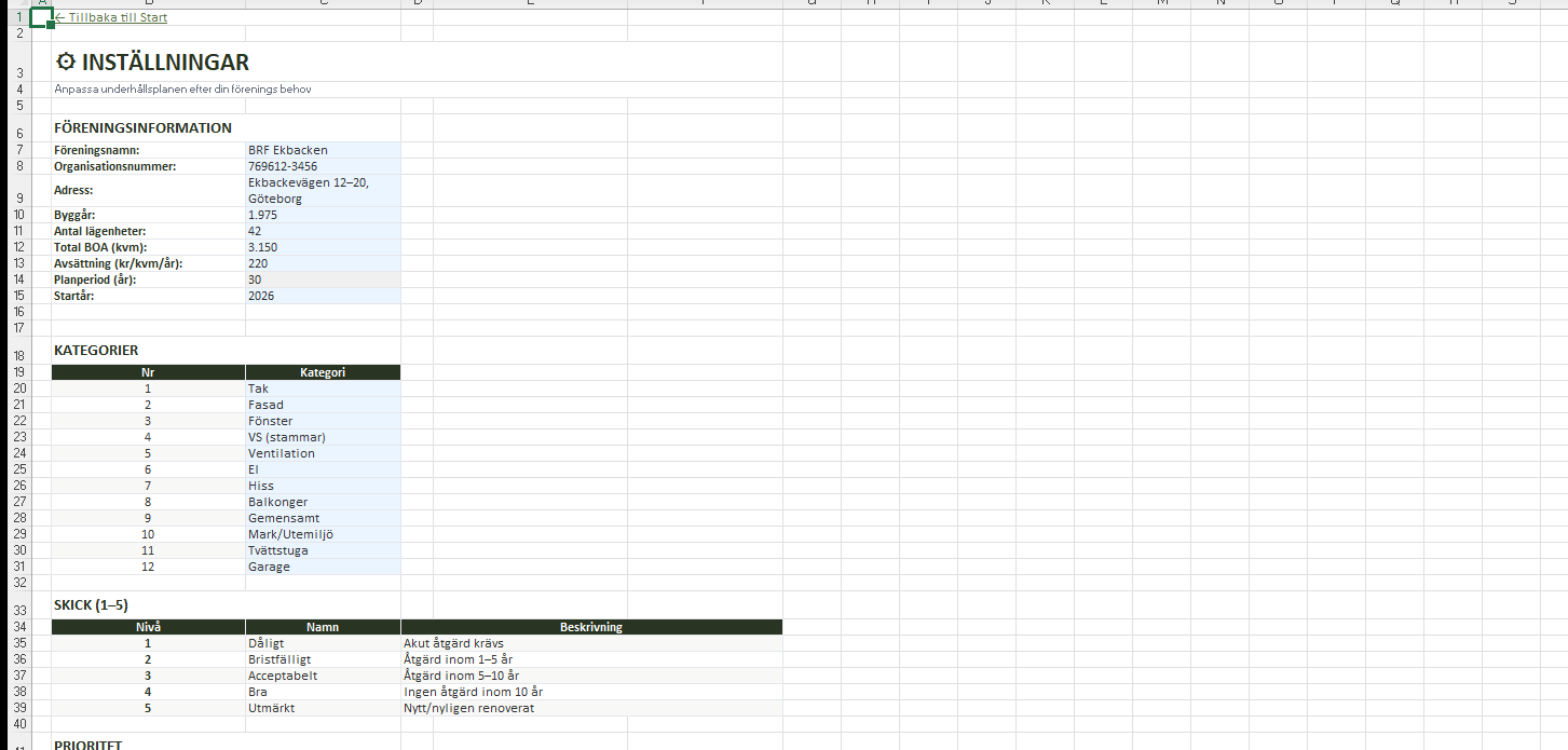 Anpassa BRF-information, kategorier (Fasad, Tak, VVS, El m.m.), skickbedömningsskala (1–5) och prioritetsnivåer. Alla ändringar sprids automatiskt till hela mallen.
