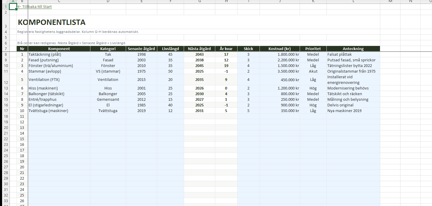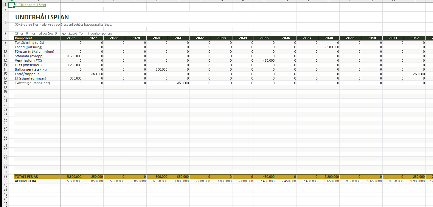 Viktig information: Denna mall är ett stödverktyg för underhållsplanering och ersätter inte en professionell besiktning. Det är styrelsens ansvar att säkerställa att underhållsplanen uppfyller Bostadsrättslagens krav för den specifika fastigheten.
